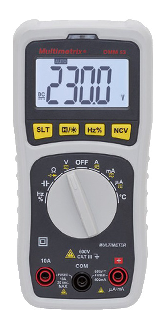 Dobře vybavený a kompaktní multimetr v kategorii CAT III. Měření AC/DC napětí, AC/DC proudů, odporu, kapacity, kmitočtu, teploty a dalších. Test propojení a test diod. Vestavěná bezkontaktní zkoušečka a svítilna.