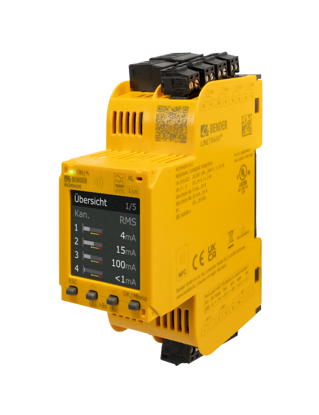 Monitory reziduálních proudů Bender nové řady SmartDetect RCMS425 se díky svojí univerzálnosti přizpůsobí téměř jakékoliv aplikaci. Přístroje řady RCMS425 mají čtyři měřicí kanály a umožňují vyhodnocovat reziduální proudy typu A (tj. proudy střídavé a stejnosměrné pulzačního charakteru), tak i B a B+ (tj. stejnosměrné vyhlazené) v souladu s normou ČSN EN IEC 62020-1. Mohou být použity ve dvou, tří i čtyřvodičových soustavách. Monitory mají úctyhodný měřicí rozsah reziduálního proudu 2 mA...70 A, přičemž hodnotu reakce na unikající proud je možné nastavit v rozsahu 6 mA...30 A u proudů typu A a 10 mA...10 A u proudů typu B.
