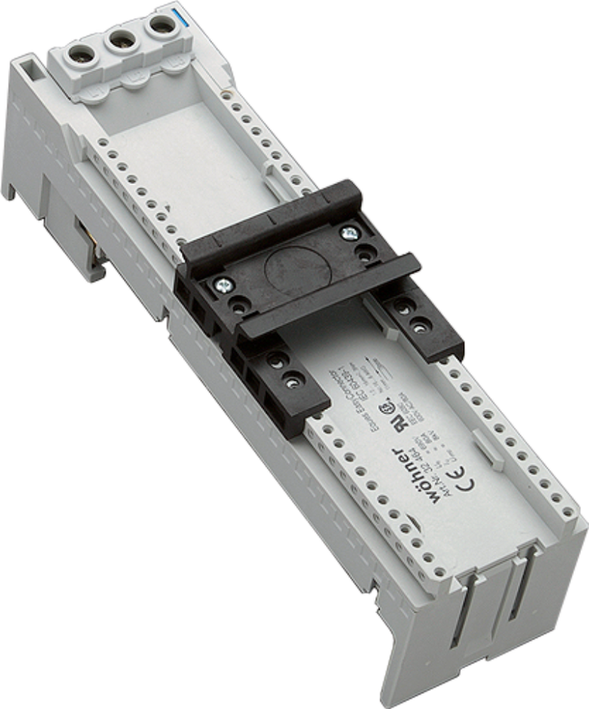 Adaptér 25A (IEC, UL), 3-pólový; 2 nastavitelné montážní lišty; bez elektrického připojení, se šroubovými svorkami 6mm2 (zezadu); rozměry: 45 x 260 x 63 mm; tep. odolnost 125°C; samozhášivost dle UL94;