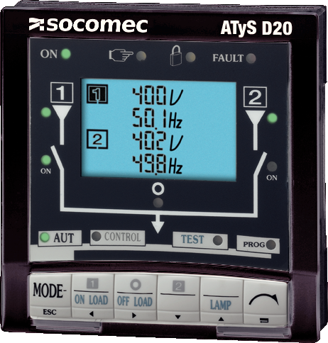 Automatický přepínač sítí s LCD displejem a mnoha funkcemi pro nastavení časových zpoždění a parametrů přístroje. Je dostupná varianta i s komunikací MODBUS (RS485).