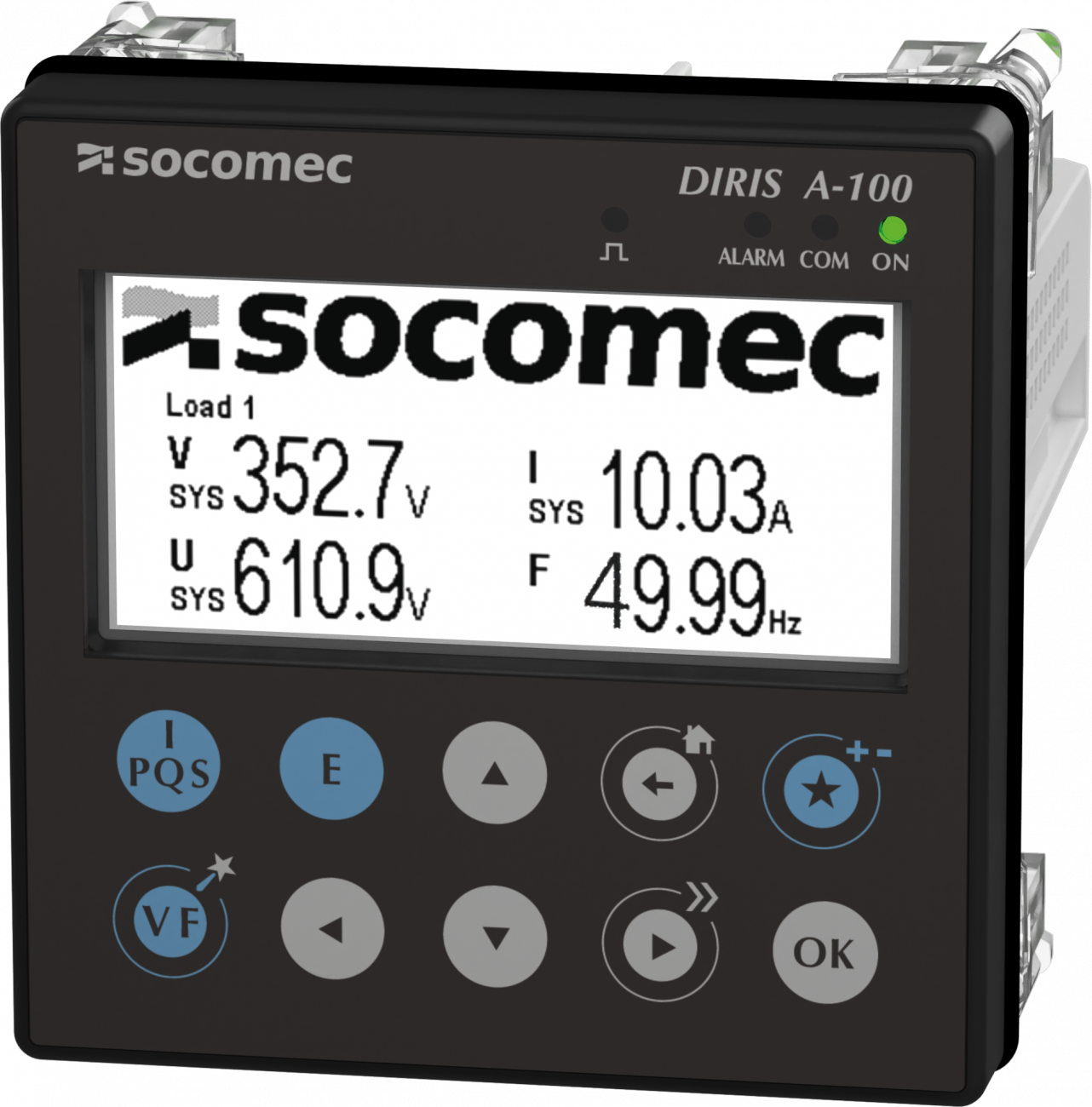 DIRIS A-100 je měřič kvality elektrického napájení pro montáž do panelu, který umožňuje komunikaci MODBUS RTU přes RS485. Čtyři nezávislé proudové vstupy RJ12 umožňují sledovat více zátěží různých typů: může jít např. o 4 jednofázové zátěže nebo 1 třífázovou a 1 jednofázovou zátěž.