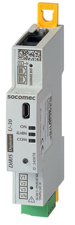 2) Napěťový modul DIRIS DIGIWARE U-xx měří napětí celého systému a informace předává přes rozhraní DIGIWARE bus do proudových modulů. V celém systému je pouze jeden napěťový modul.
