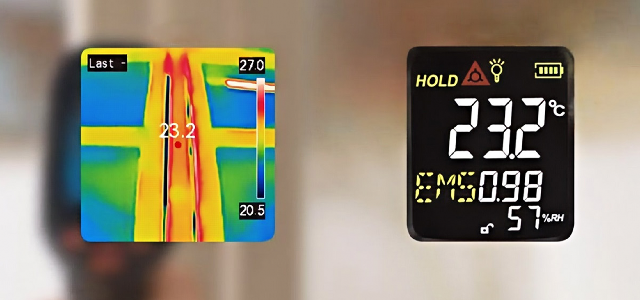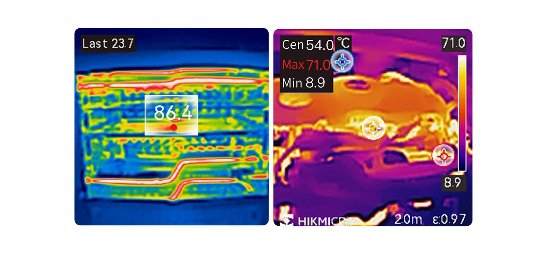 Zapomeňte na kontroly v jednom bodě. Nahraďte nudná čísla vizuálními prvky, které v reálném čase odhalí každou vadu izolace na celé obrazovce. Na obrázku vlevo zobrazení termokamery HIKMICRO, vpravo displej běžného bezkontaktního teploměru