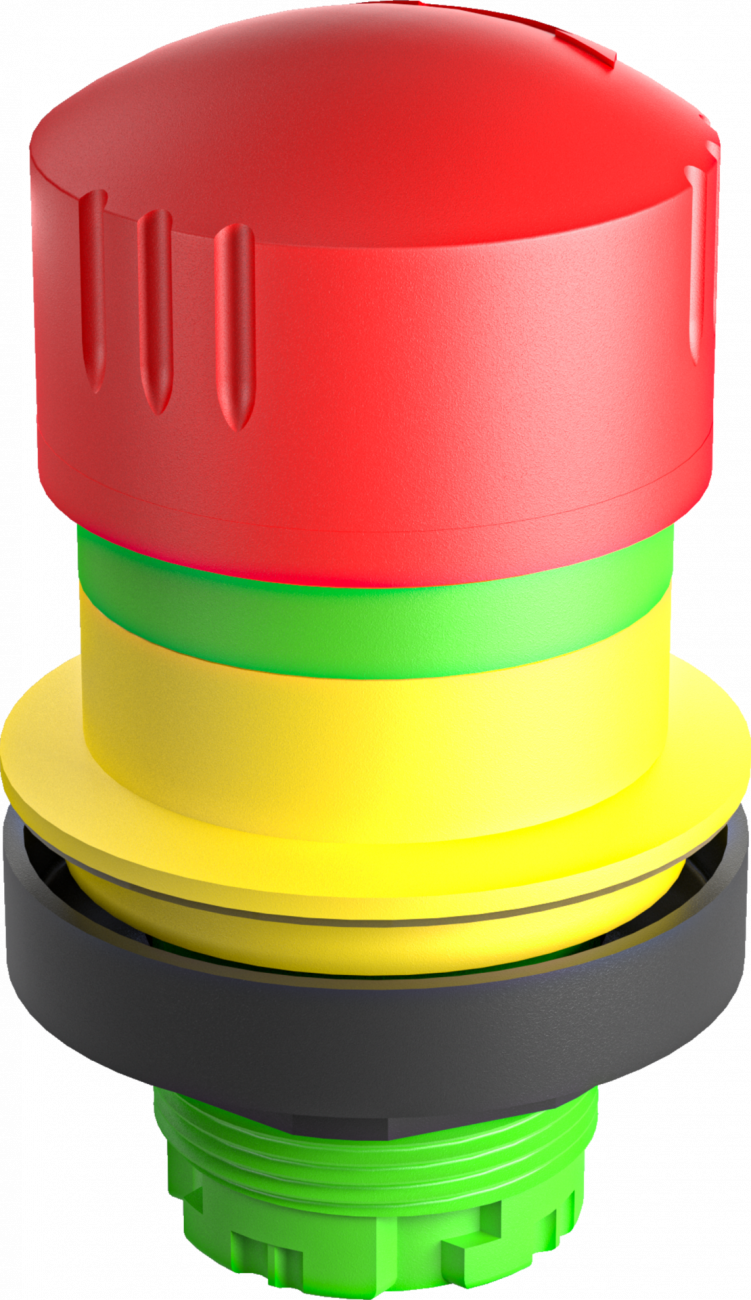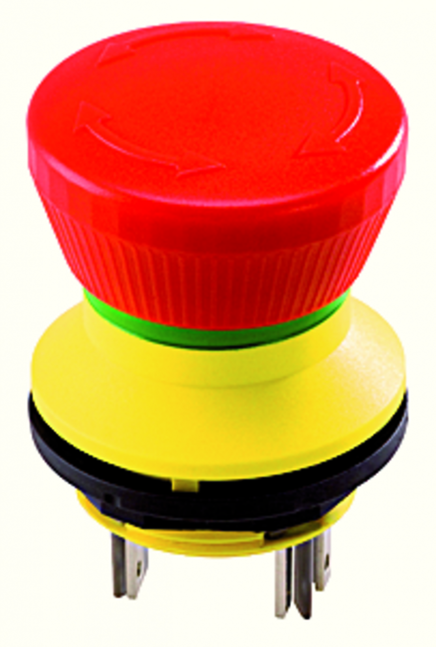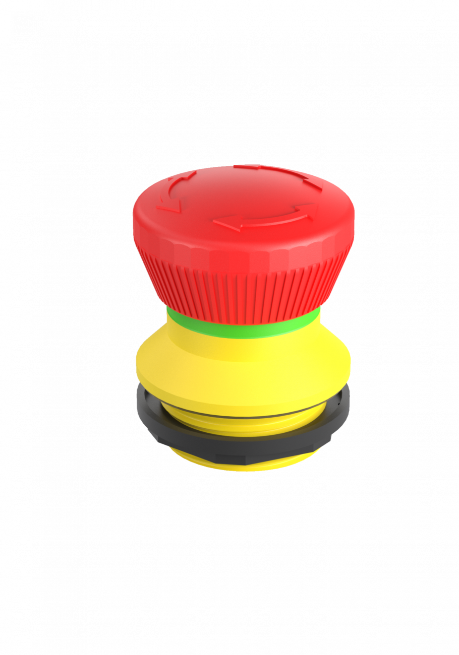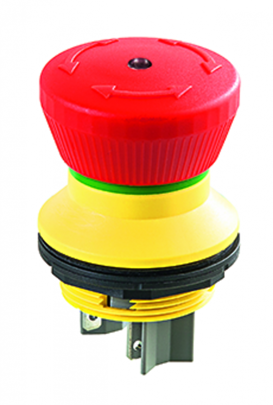 Nouzová tlačítka mají vysunutou hlavicí kulatého tvaru s kruhovým nebo čtvercovým výřezem do panelu.Hlavice jsou primárně určená k nouzovému vypnutí a rozpojení elektrického obvodu při nouzové situaci.