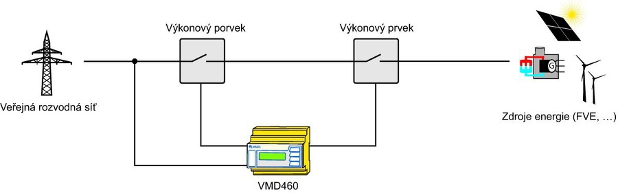 V případě nepřípustných hodnot napětí a frekvence má VMD460-NA za úkol odpojení systému výroby elektrické energie od rozvodné sítě pomocí výkonového prvku ve stanoveném čase. V případě stanovených hodnot napětí a frekvence pro zapnutí, má VMD460-NA za úkol připojení systému výroby elektrické energie k rozvodné síti ve stanoveném čase. Přístroj může být instalován a připojen přímo na centrálním panelu a vyžaduje pomocné napájecí napětí.